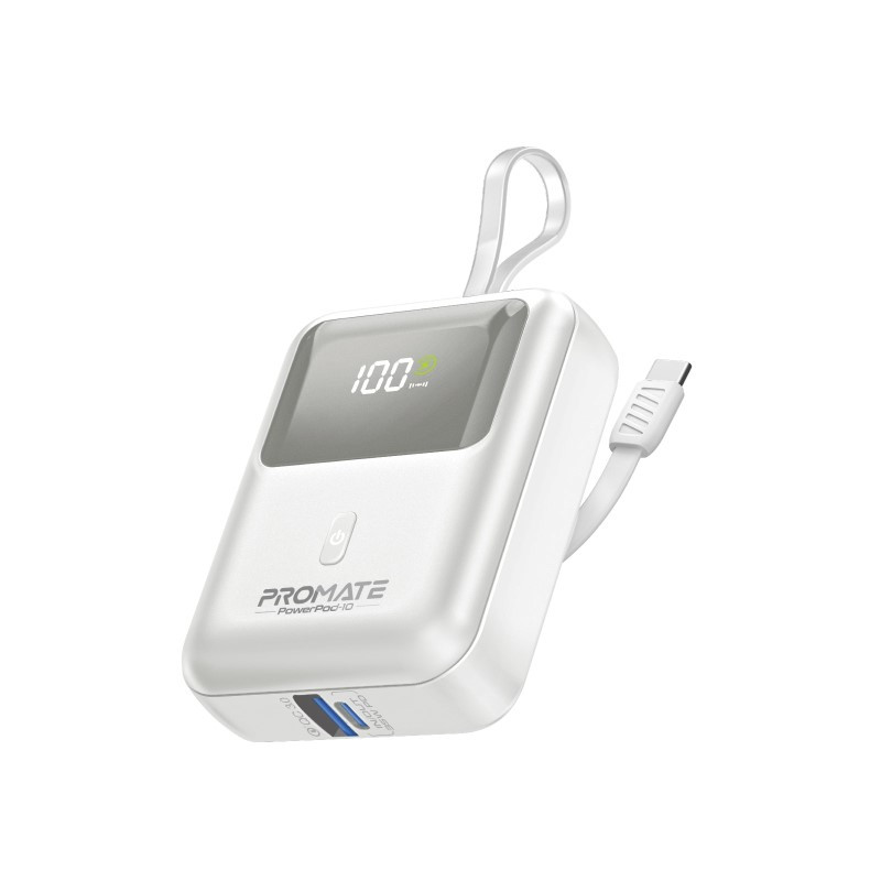 اشحن جهازك بسهولة باستخدام PowerPod-10، البطارية المتنقلة بسعة 10,000 مللي أمبير التي تحتوي على كابل USB-C™ مدمج، وتتميز بمنفذ توصيل طاقة USB-C™ بقدرة 35 واط ومنفذ USB-A بقدرة 18 واط QC 3.0، بالإضافة إلى نظام حماية متعدد يضمن الشحن الآمن عبر حماية الجهد والتيار الزائد والشحن الزائد، مع شاشة LED ذكية تعرض الشحن المتبقي، مما يجعلها الخيار المثالي للحياة العصرية بفضل سهولة الحمل والموثوقية.