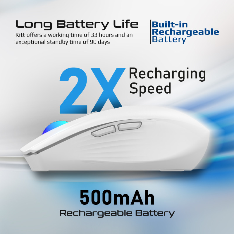 تتميز Kitt ببطارية مدمجة بقوة 500 مللي أمبير في الساعة، مما يضمن استخدام طويل دون تأثير على الأداء. يمكن إعادة شحن الماوس بسرعة مضاعفة باستخدام كابل USB-C™ المرفق، مما يسمح بالعودة إلى العمل بسرعة ويقلل من فترات التوقف.